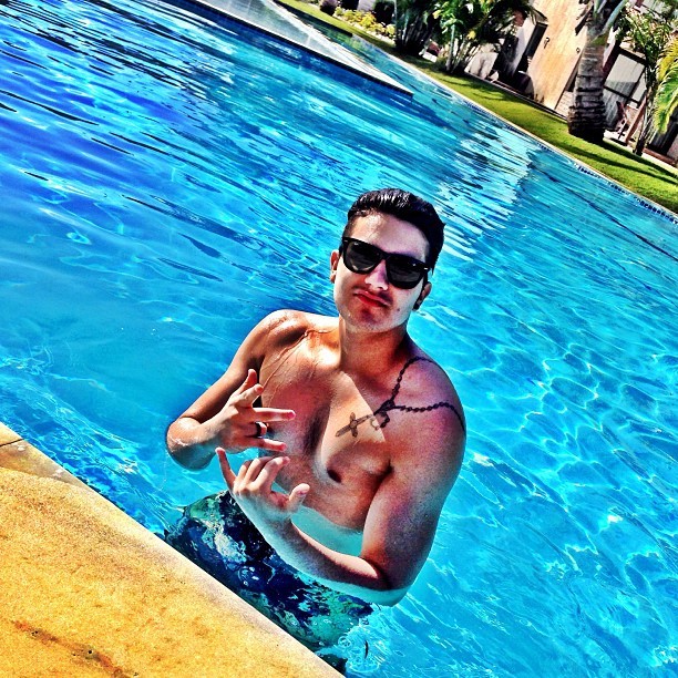 foto na qual aparece dentro de uma piscina. Sem camisa, ele mostra que